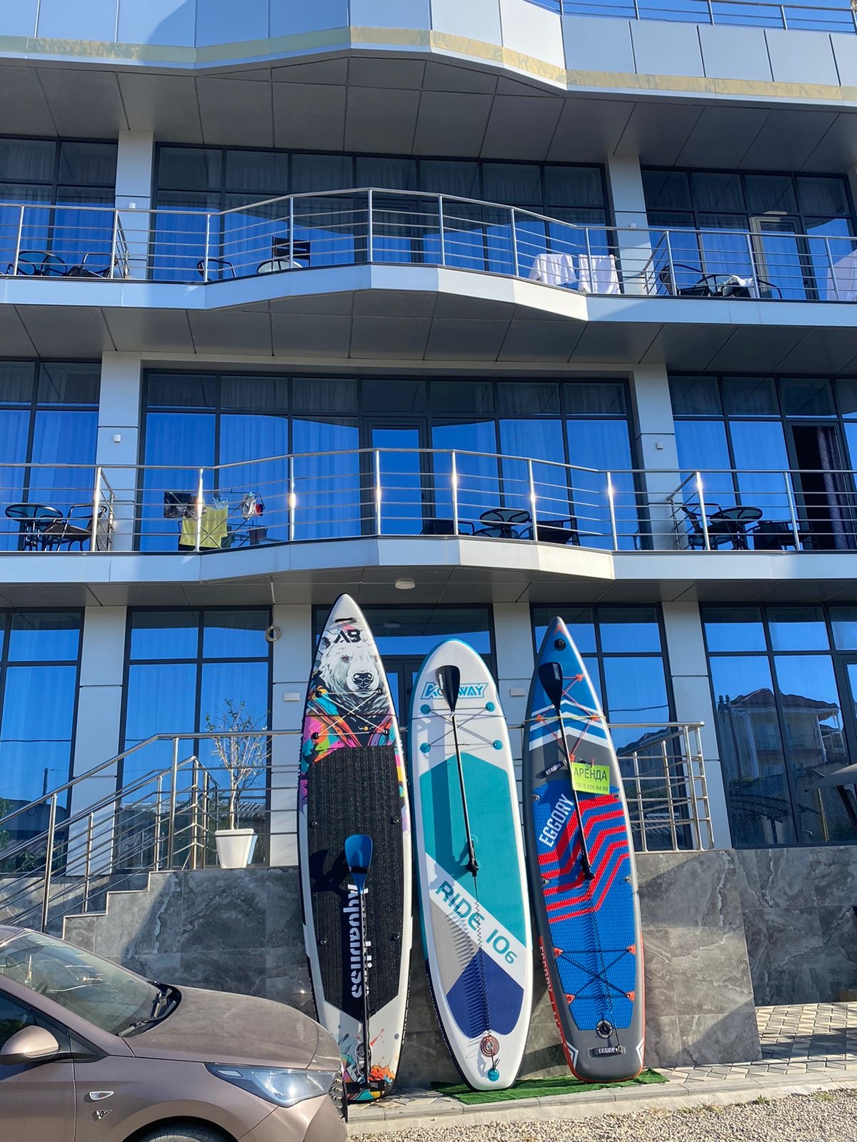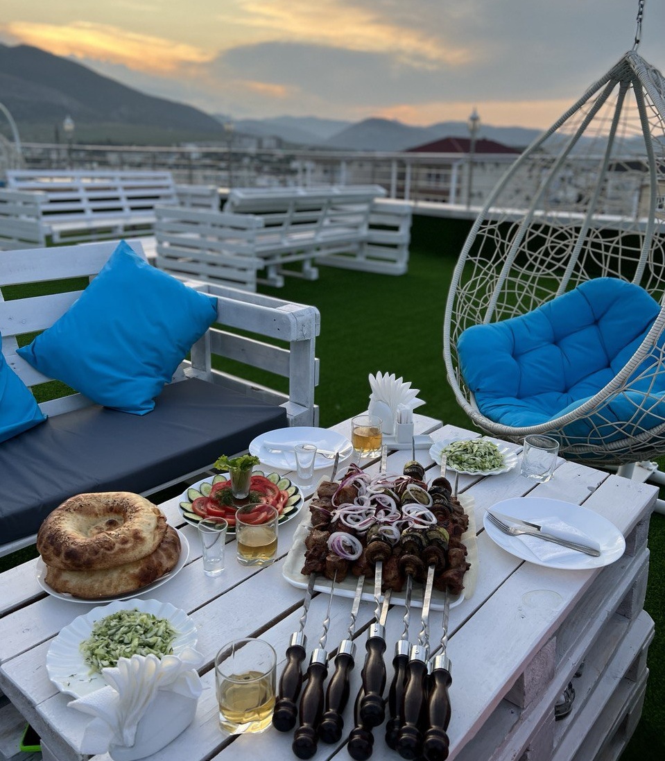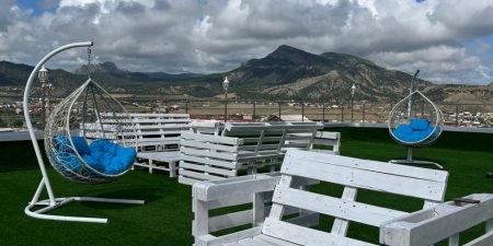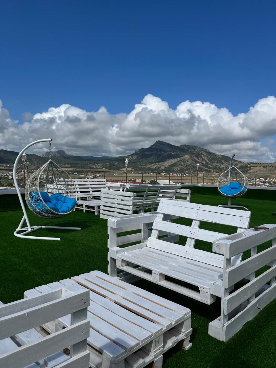 На террасе 4-го этажа расположены шезлонги, столики и стульчики – невероятный вид на море, горы, который запомнится на всю жизнь, и дает возможность фотографироваться на фоне закатов! Вид не только на море и горы, но и на сам город Судак, Новосветские бухты и главную достопримечательность Судака – Генуэзскую крепость.